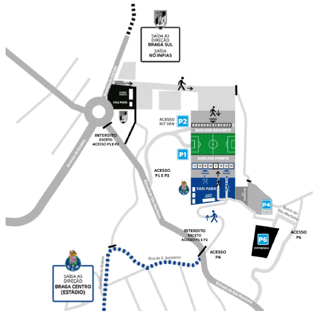 -A bancada Poente (contrariamente ao que é habitual na deslocação a Braga) está, neste jogo, reservada aos adeptos do FC Porto, pelo que as indicações deverão ser seguidas na íntegra, sendo muito importante, por questões de segurança, que seja cumprido tudo o que está definido em termos de acessos;