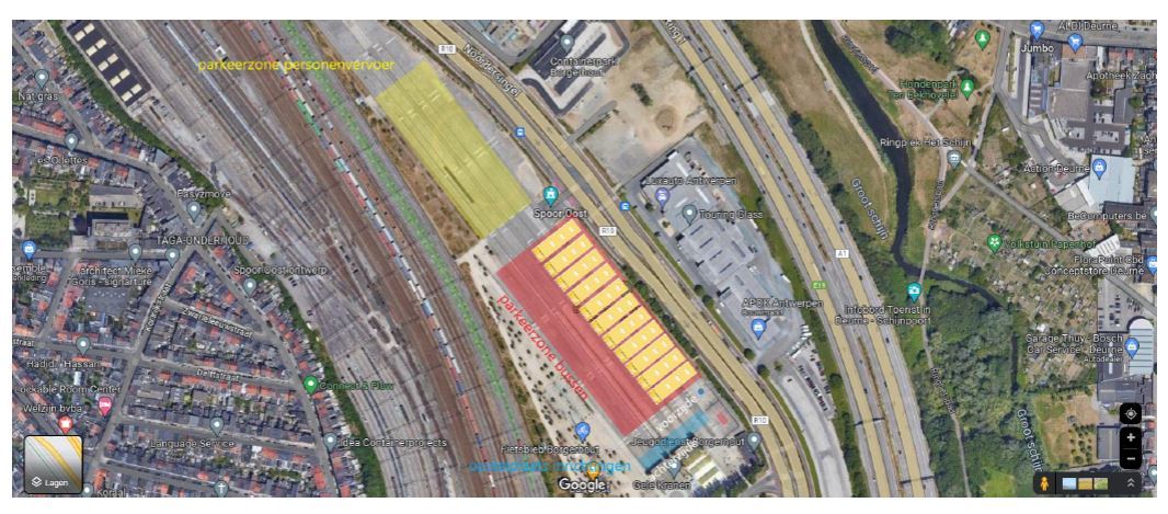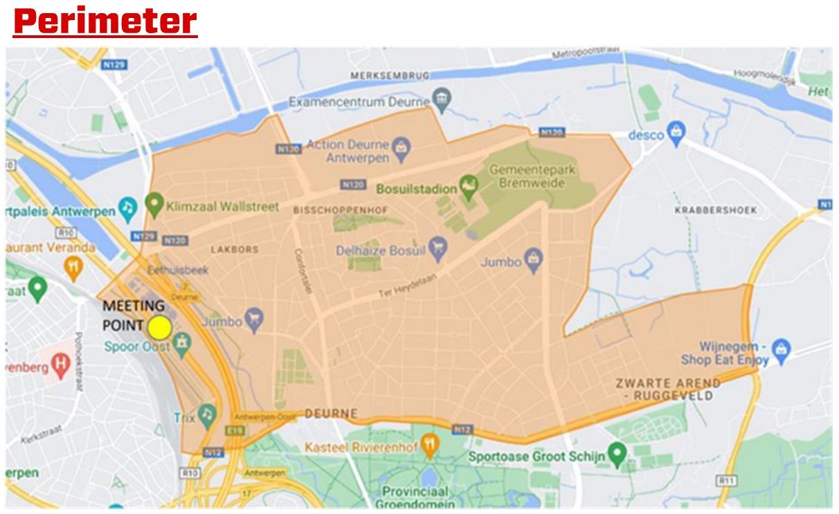 O perímetro, documentado na imagem abaixo, inclui as seguintes ruas: Schijnpoortweg (perto de Lange Lobroekstraat)- Spoor Oost (Meeting Point)- Buurtspoorweglei- N10 Noordersingel/N12 Turnhoutsebaan tot aan Houtlaan (Wijnegem)- Houtlaan- Ertbruggestraat - Ertbruggelaan - Schotensesteenweg - Muggepad - Deurnesteenweg - door de wei tussen Wokpaleis en Benzinestation Gabriëls - Merksemsebaan (N120) - Industrielaan- Bisschoppenhoflaan- Kruiningenstraat- Melkerijstraat- Middelmolenlaan- Santvoortbeeklaan- Belcrownlaan- Merksemsesteenweg- Vaartdijk- Burgemeester Gabriël Theunisbrug - Schijnpoortweg (perto de Lange Lobroekstraat).