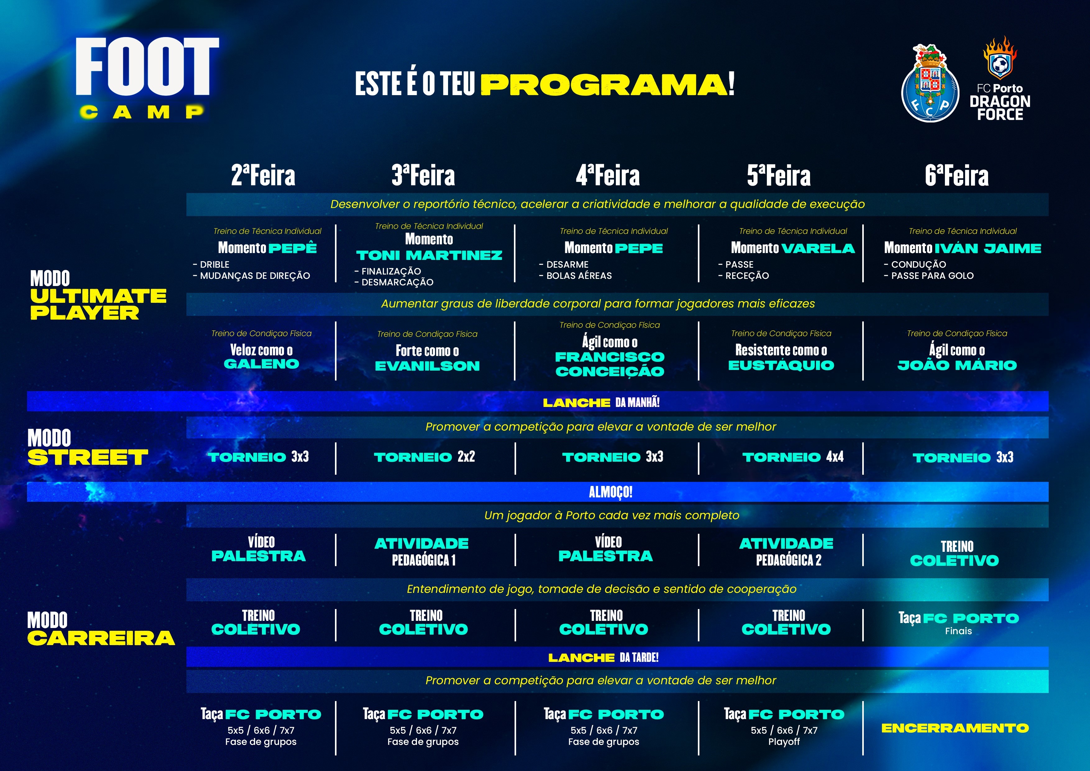 Pedro Pinto, Coordenador Técnico do Departamento de Eventos do Projeto Dragon Force, garante que as 40 horas de Foot-Camp serão verdadeiramente aquisitivas, num registo de muita diversão: “O programa será implementado tendo em conta a Metodologia FC Porto e a referência aos jogadores da equipa A do clube, sempre com recurso a materiais inovadores. As Sessões de Treino (Condição Física, Técnica Individual e Coletivo) são sempre construídas tendo em conta a idade e o nível de cada participante. Os momentos de competição acontecem sempre num formato pensado para garantir que todos tocam muitas vezes na bola e são protagonistas na posição que mais gostam, promovendo diversas tomadas de decisão importantes.”