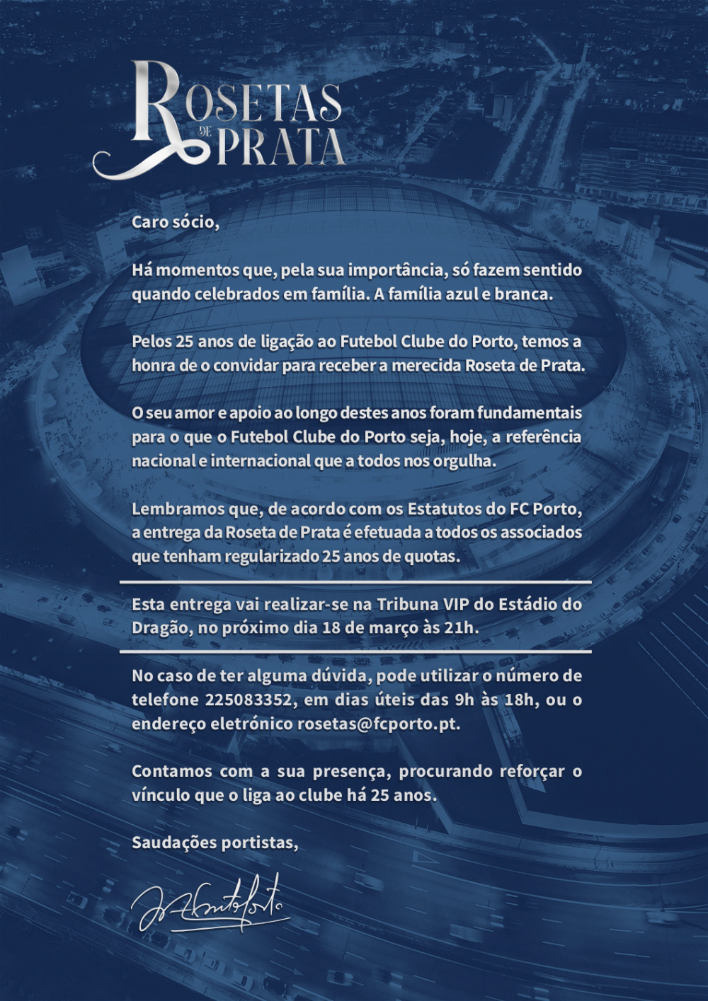 Caso esteja habilitado a receber a Roseta de Prata e não tenha sido contactado, deverá informar o clube através do número 225 083 352, em dias úteis das 9 às 18 horas, ou do endereço eletrónico [email protected]. para que a situação seja esclarecida.