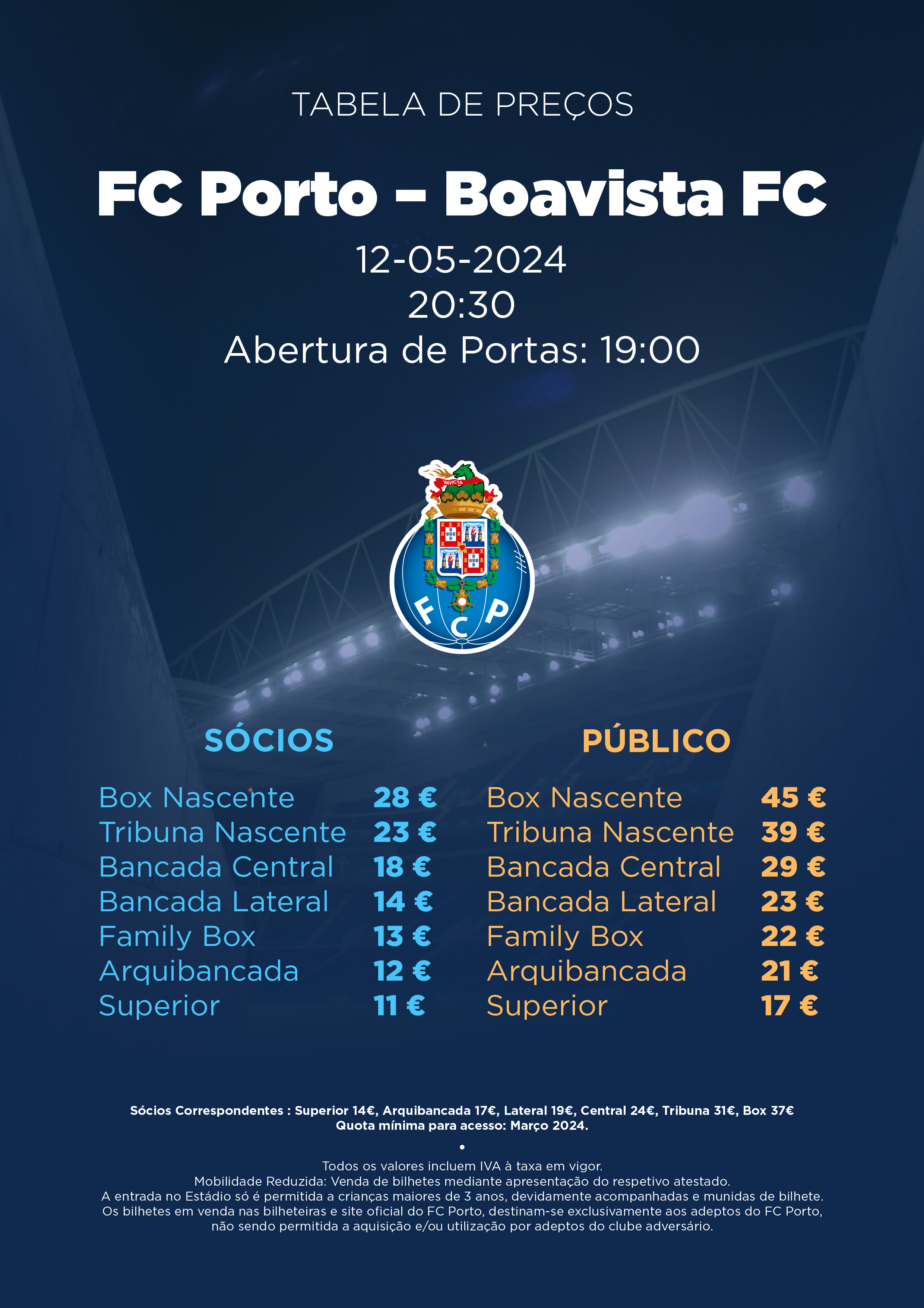 Já se encontram disponíveis os bilhetes para o jogo entre o FC Porto e o Boavista, referente à ronda 33 do campeonato, marcado para domingo às 20h30 no Estádio do Dragão (Sport TV).