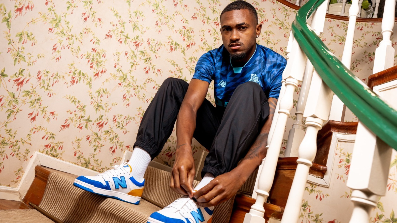Como uma armadura, o padrão cria um efeito disruptivo de camuflagem, com o qual combinam os pormenores azul celeste, com destaque para o emblema, aplicado com a tecnologia de transfer da New Balance.