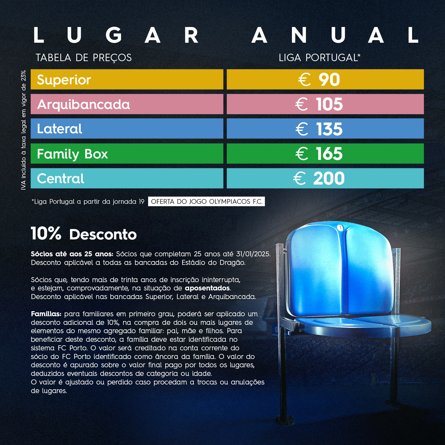- Prioridade e condições especiais na compra de bilhetes para jogos não incluídos no Lugar Anual, bem como para jogos fora do Estádio do Dragão;