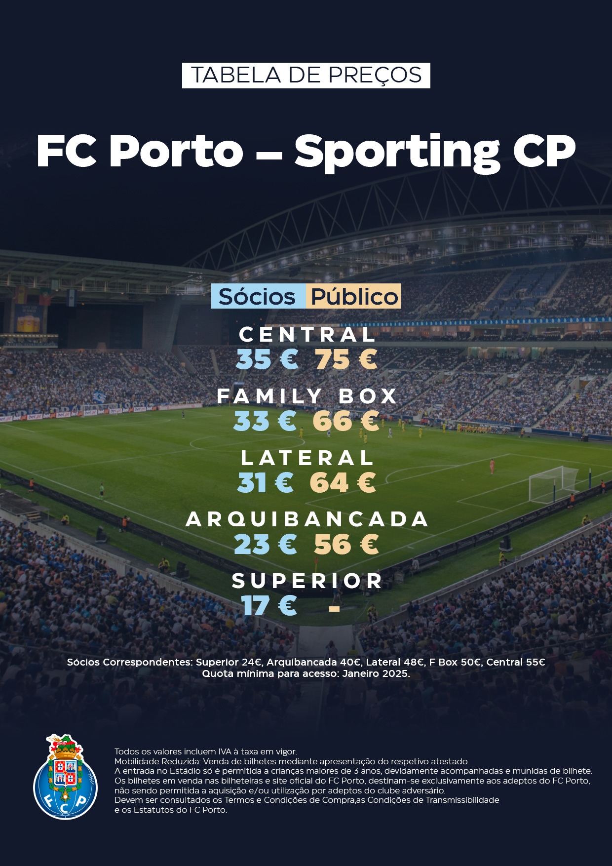 Já estão disponíveis os bilhetes para o jogo entre FC Porto e Sporting agendado para as 20h15 do dia 7 de fevereiro, uma sexta-feira, no Estádio do Dragão (Sport TV1).
