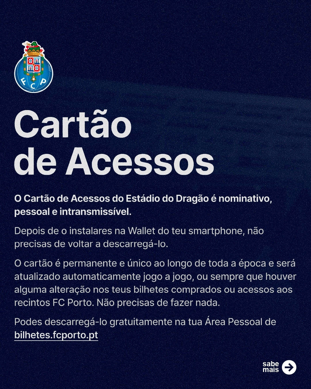 Atualizado de forma automática, o Cartão de Acessos é gratuito e universal e, assim que descarregado na Área Pessoal de cada utilizador registado em bilhetes.fcporto.pt, ficará visível na Wallet do utilizador. Para entrar no Estádio do Dragão ou no Dragão Arena basta aproximar o smartphone dos torniquetes.