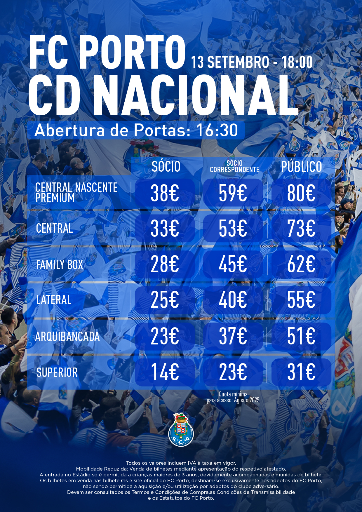Já se encontram disponíveis os bilhetes para o jogo entre o FC Porto e o CD Nacional. O embate da quinta ronda do campeonato está agendado para as 18h00 do próximo dia 13, um sábado, no Estádio do Dragão (Sport TV).