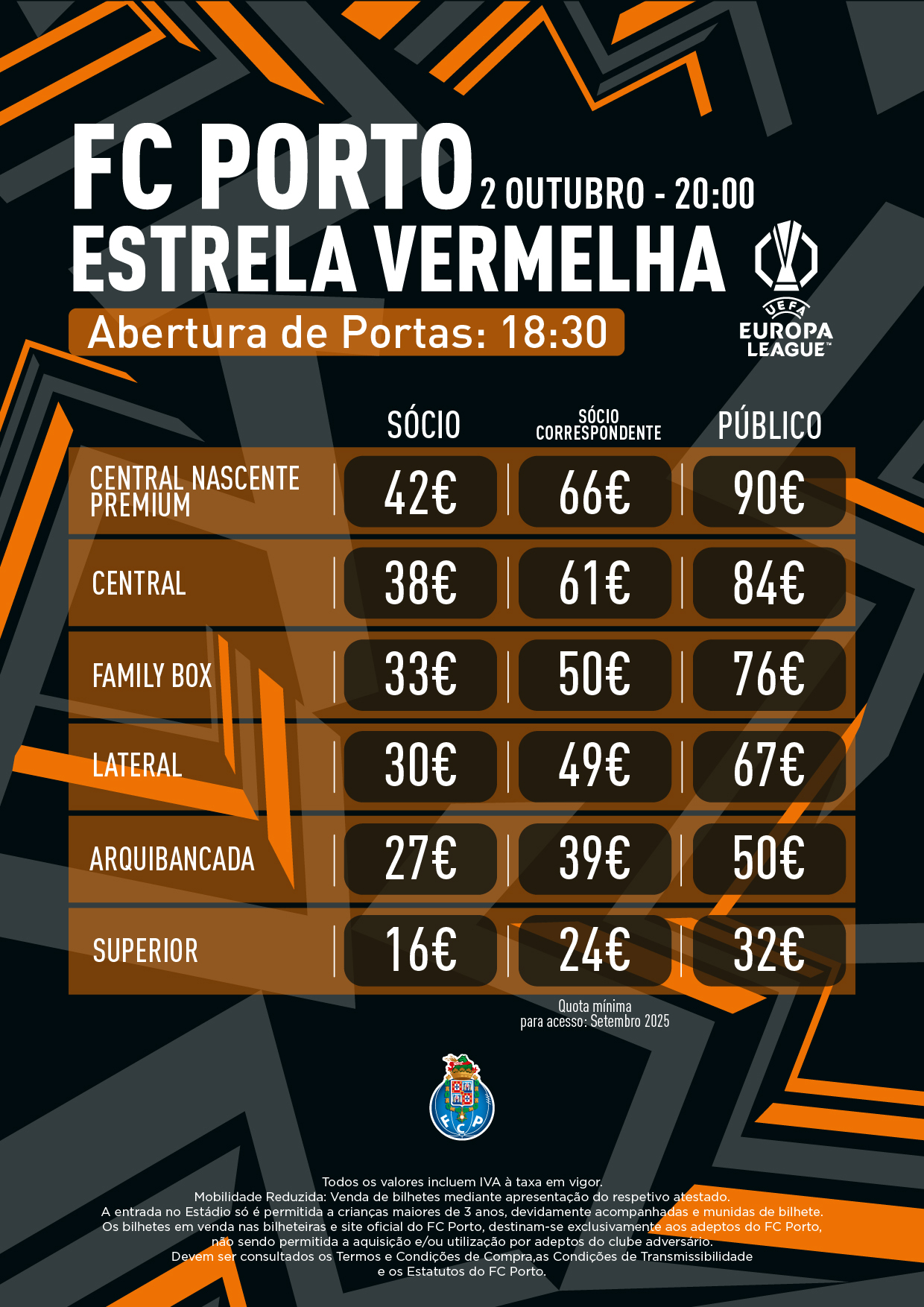 As portas do Estádio abrem às 18h30 e quota mínima para acesso é a de setembro.
