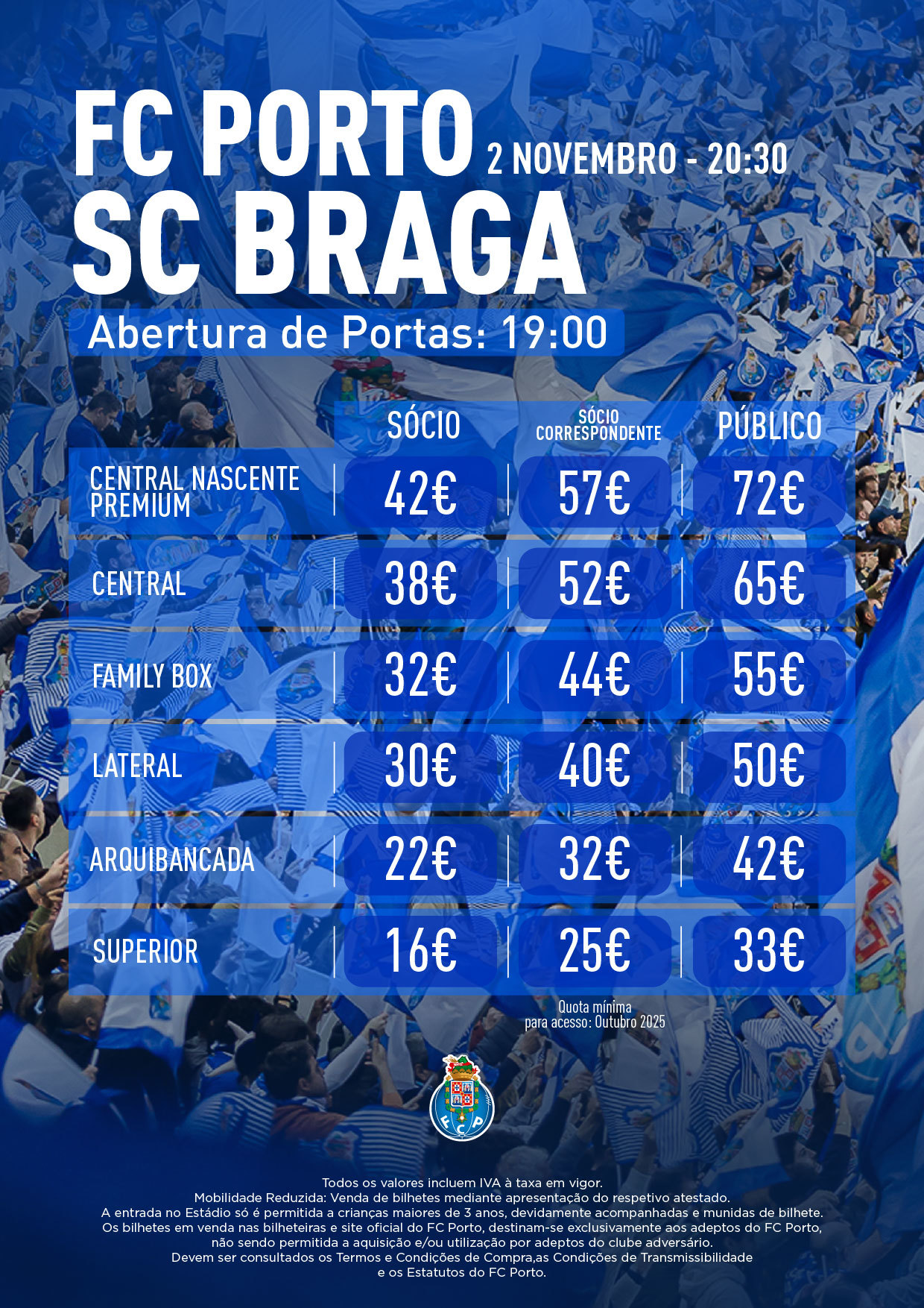 Já estão disponíveis os bilhetes para o jogo entre o FC Porto e o SC Braga. O embate da décima ronda do campeonato está agendado para as 20h30 do próximo dia 2 de novembro, um domingo, no Estádio do Dragão (Sport TV).