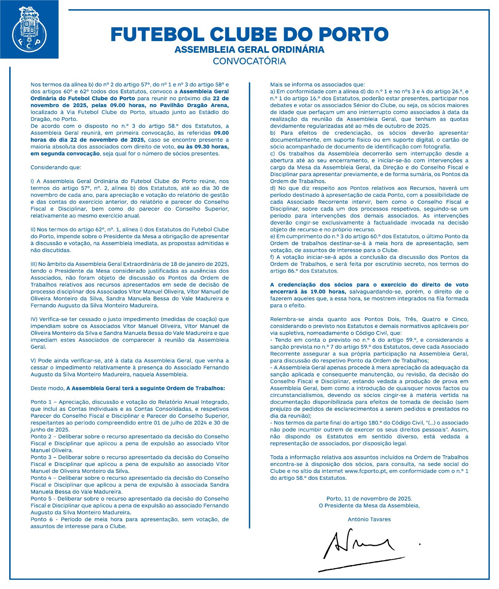 Nos termos da alínea b) do n.º 2 do artigo 57.º, do n.º 1 e n.º 3 do artigo 58.º e dos artigos 60.º e 62.º, todos dos Estatutos, convoco a Assembleia Geral Ordinária do Futebol Clube do Porto para reunir no próximo dia 22 de novembro de 2025, pelas 09:00 horas, no Pavilhão Dragão Arena, localizado à Via Futebol Clube do Porto, situado junto ao Estádio do Dragão, no Porto.