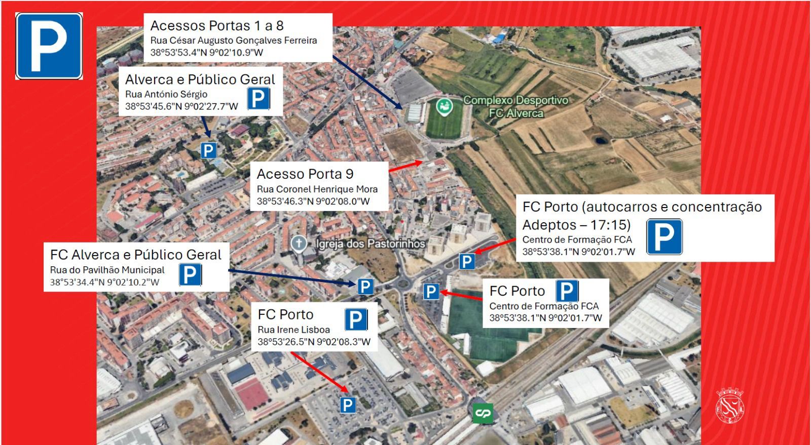 - Existem três parques destinados aos adeptos do FC Porto (ver imagem). Os portistas que viagem em viaturas ligeiras devem estacionar na Rua Irene Lisboa ou no Centro de Formação FCA. Os autocarros dos Grupos Organizados de Adeptos também vão parar neste último local;