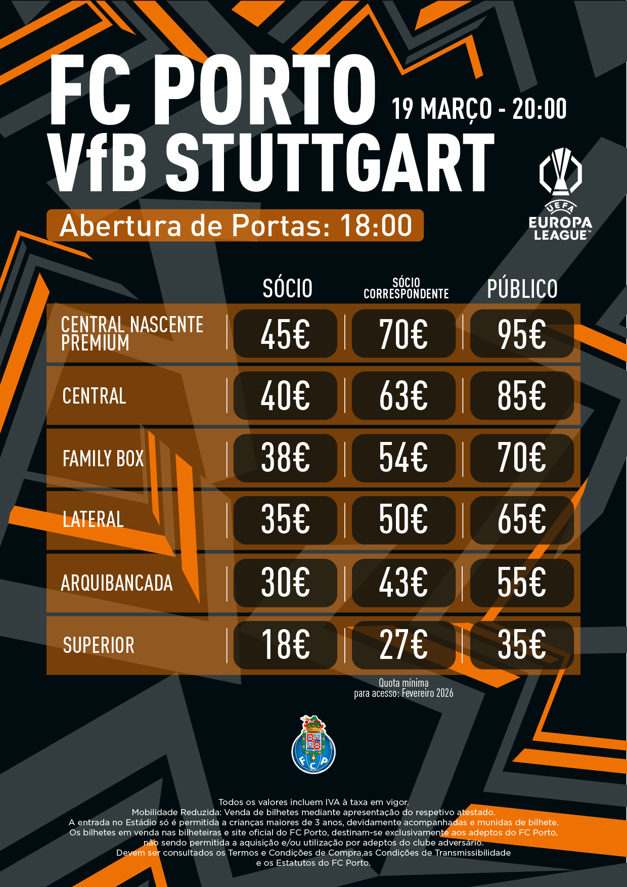 As portas do Estádio abrem às 18h00 e quota mínima para acesso é a de fevereiro.